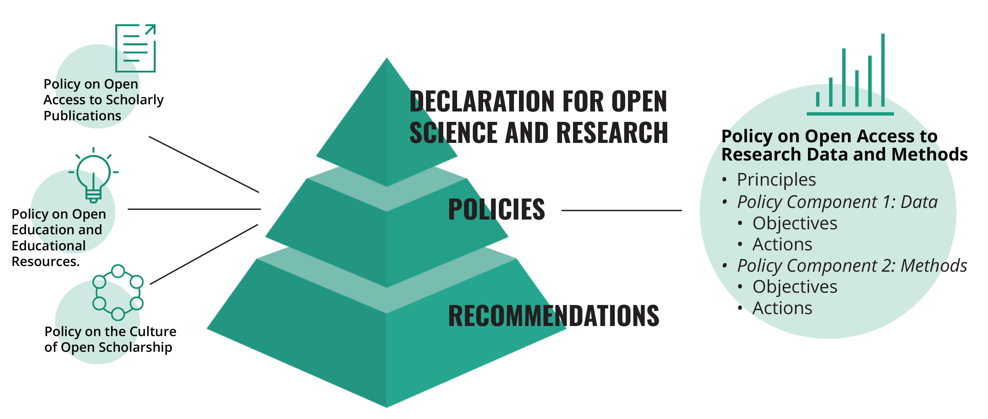 | current | 11:58, 28 November 2022 | 3,145 × 1,334 (651 KB) | Admin (talk | contribs) | A pyramid represents the policy strucuture with the Declaration for open science and research at the top. The next level consists of policies and the base is recommendations. The policy level mentions the following: Policy on open access to scholarly publications, Policy on open education and educational resources, and Polic on the culture of open scholarship. The focus is on the Policy on open access to research data and methods, which consists of strategic principles and the policy componen... |