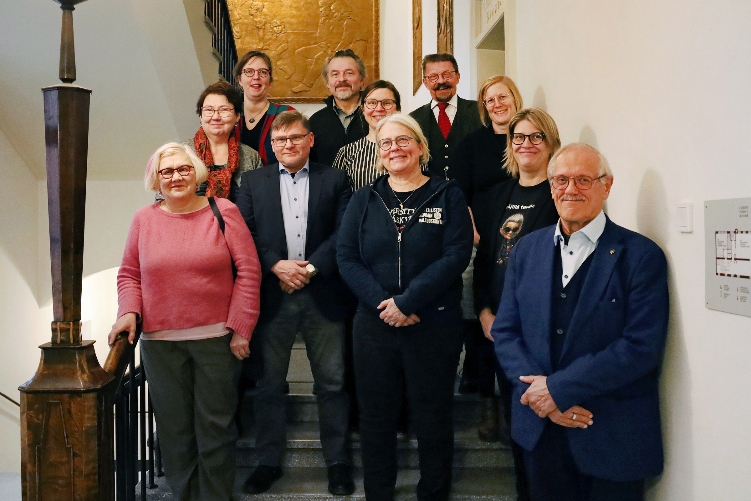 TSV:n hallituksen varsinaisia jäseniä ja varajäseniä. Alarivi (vas.) Heta Pyrhönen, Petri Karonen, Taina Saarinen, Outi Fingerroos, Kimmo Kaski, keskellä (vas.) Katariina Mustakallio, Liisa Kulmala, Anna Lintunen, ylhäällä (vas.) Emilia Palonen, Mika Helander, Jukka Mahönen. Kuva: Anne Haapanen / TSV.